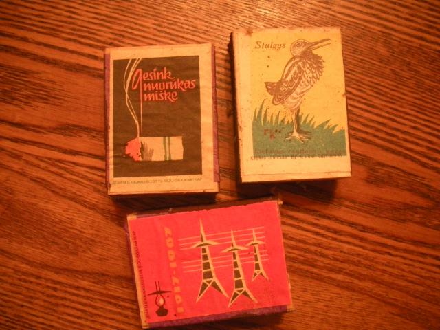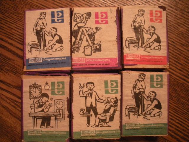 senovinės (medinės) degtukų dėžutės (su degtukais). Etiketės su Lietuvos TSR spartakiada 1978m.; buities tarnyba jūsų paslaugoms ir dar 3 iš kt. serijų.