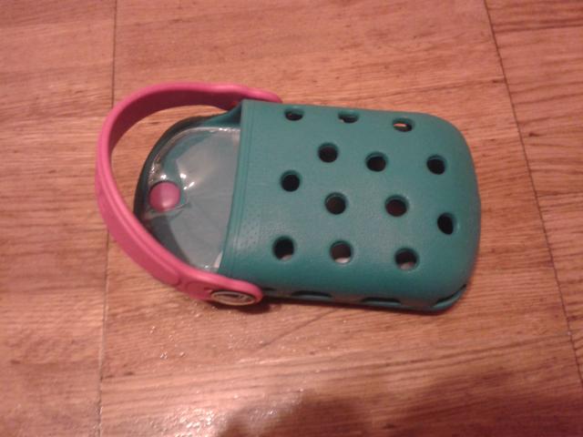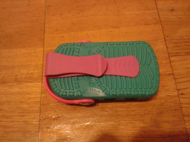 Dėklas telefonui prie diržo, kuris primena crocs šlepetę. Taip pat yra virvutė (kilpa) dėklui pasikabinti ant kaklo ar šiaip kur. Viduje yra plasmasinė permatoma kišenėlė pinigams ar lapeliams susidėti.