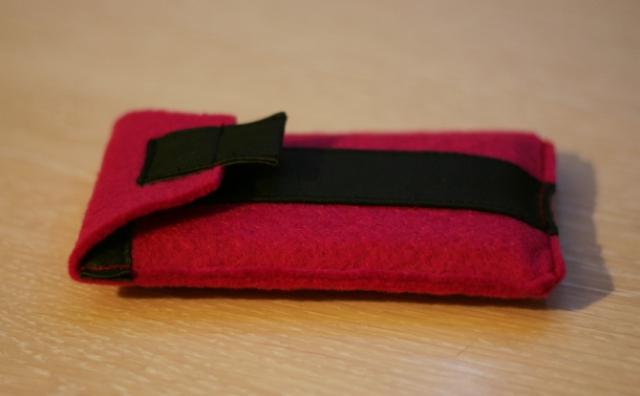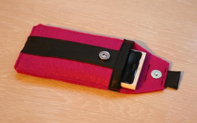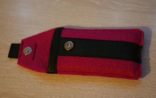 Dėklas mobiliam telefonui. Išmatavimai 8,5 cm x 14,5 cm. Sudėtis: filcas ir natūrali oda.