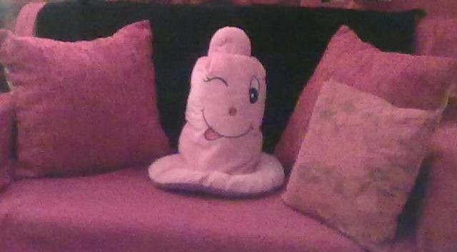Galima naudoti kaip dekoratyvinę pagalvę,taip pat kaip karnavalinę kepurę(nes galima užsimauti ant galvos-pagalvės viduje yra ertmė). Ryškiai ružava,minkšta,linksma,didelė... Jei domins-išmatuosiu cm dydį.