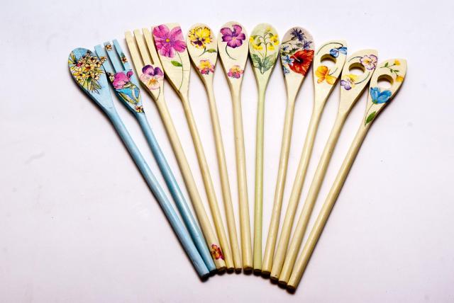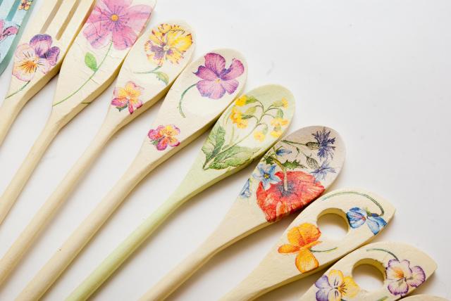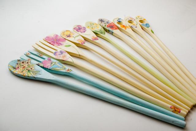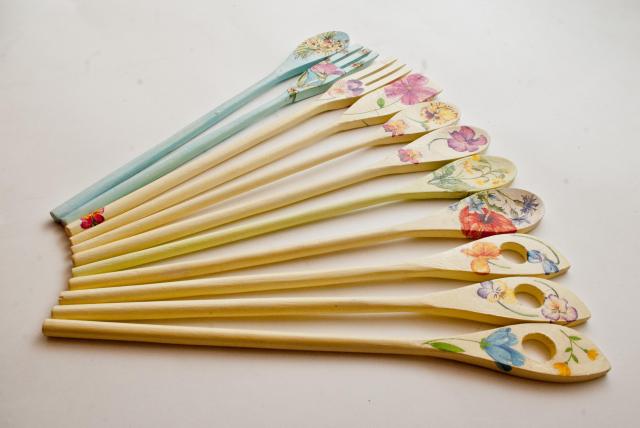 Įvairūs dekoruoti mediniai įrankiai dekupažo technika, lakuoti.