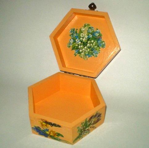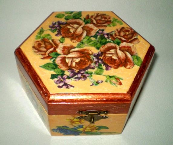 Dekupažo dėžutė- šešiakampė, 12*12 cm, puošta rožytėmis.