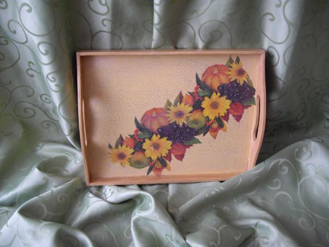 Dekupažo technika dekoruotas padėklas "Derlius" Galima atlikti ir individualius užsakymus ir dekoruoti norimus daiktus. Daugiau parduodamų dekoruotų daiktų adresu www.dekupazonamai.lt
