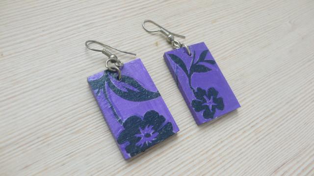 Naujos, nenesiotos, violetiniai dekupazo auskarai.