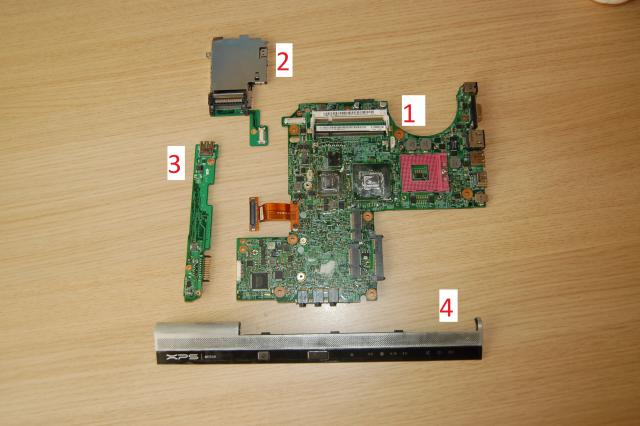 1. Motininė plokštė (PARDUOTA), 2. Adapterių lizdas/pultelio laikiklis, 3. Baterijos lizdas + usb lizdas, 4. Šleifas (veikia puikiai, bet labai nutrintas) KITOJ NUOTRAUKOJ: to paties kompiuterio kampas plastmasinis (dešinės pusės) visiškai naujas 15 Lt.