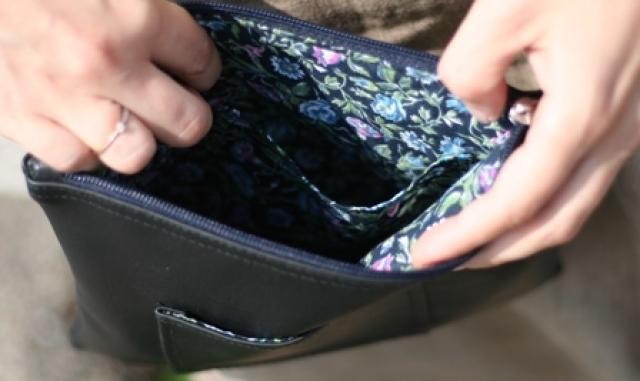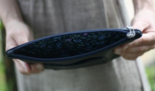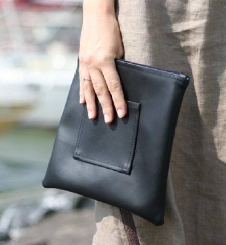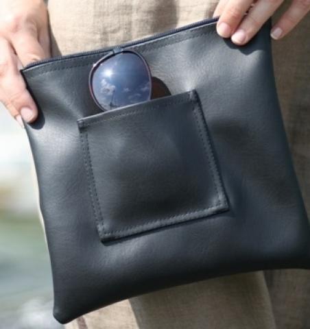 Juodos spalvos delninukas-kosmetinė su kišene. Dirbtinė oda. Viršuje užsegamas užtrauktuku. Pamušalas mėlynas su gėlytėmis. Išmatavimai: 22x24 cm