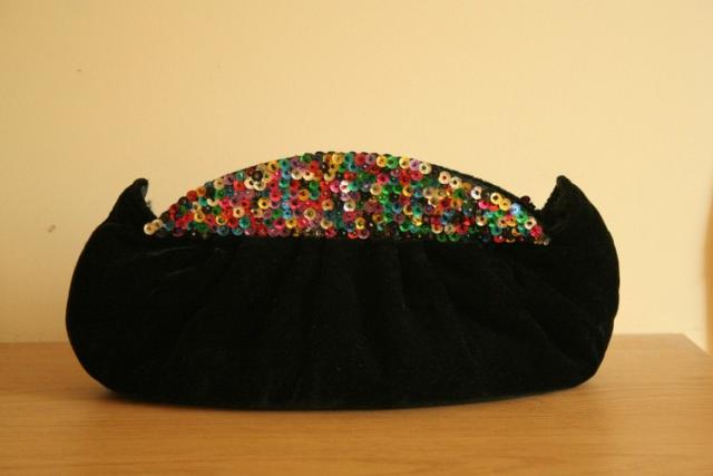 Juoda aksominė, su blizgia, karoliukais išsiuvinėta viršutine dalimi. Daili, puikios būklės.
