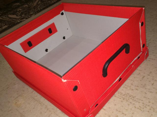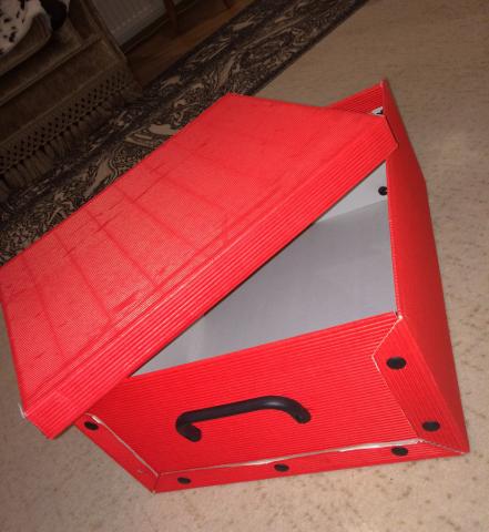 Raudona dėžė skirta susidėti daiktus. Labai patogi. Turi nedaug įbrėžimų, bet vis dėlto atlieka savo darbą.