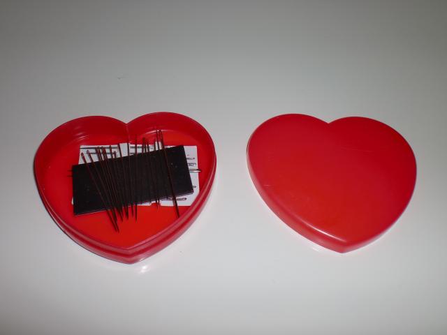Naudota plastmasinė dėžutė, galima susidėti smulkmenas kokias tik norite mažiukus auskariukus, mažas sagutes, ar adatas... Adatos dėl parodos nemainau jų.
