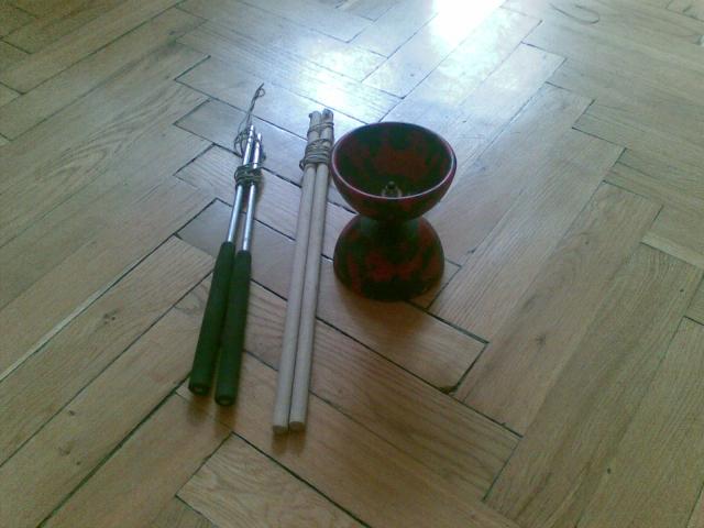 Beveik nenaudotas diabolas su metalinėm ir medinėm lazdelėm, labai geros būklės.