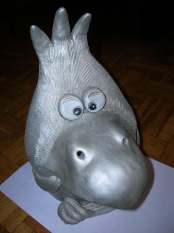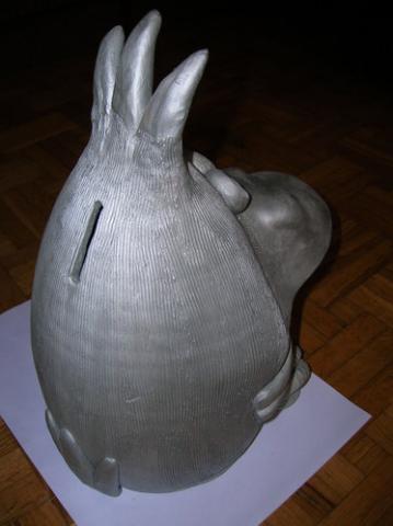 Didelė. Sidabrinės spalvos. Talpi (taupykit į sveikatą). Apačioje skylutė pinigų išėmimui, tik pamečiau tą kamštuką, bet ten kažkuo kitu užlipdyt galima nesunkiai ;]