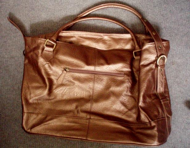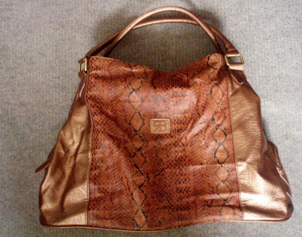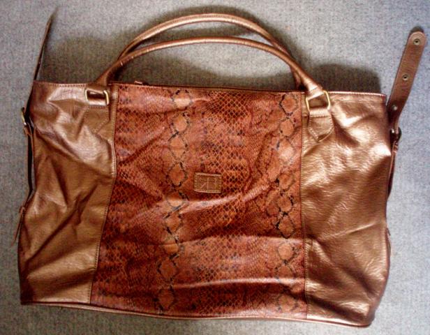 Didelė rudos spalvos rankinė. Laaaabai talpi. dvi neilgos rankenos, bet puikiai tinka nešioti ant peties. Visa rankinė turi vario atspindį, o viena pusė puošta gyvatės odos imitacija. Atsiprašau už sulamdyma, gavau dovanų ir laikiau spintoje sulankstytą...