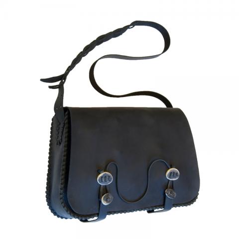 Natūrali oda (2 mm storio). Matmenys 36x25x12 cm (telpa A4 formato segtuvas). Užsegimui panaudotos iš rago gamintos sagos. Trijų skyrių, papildomas skyrelis telefonui, prisiūtas karabinas raktams prisegti.