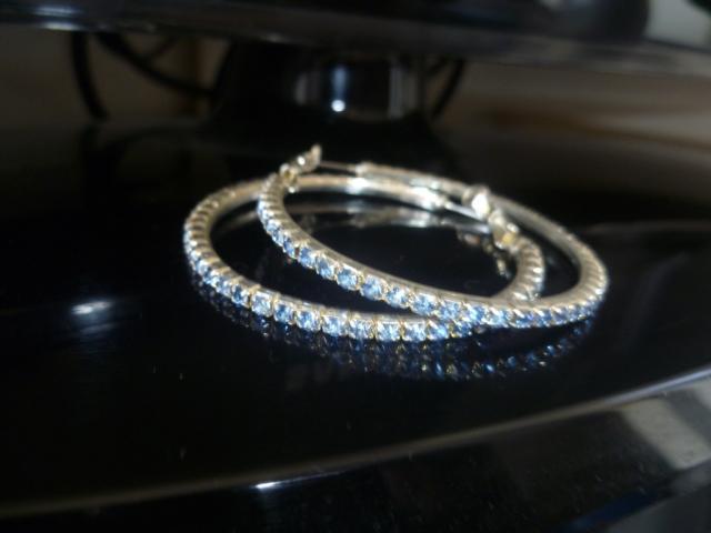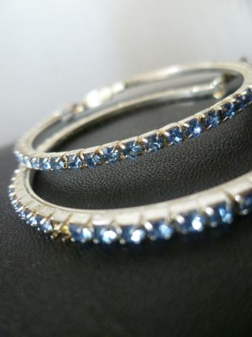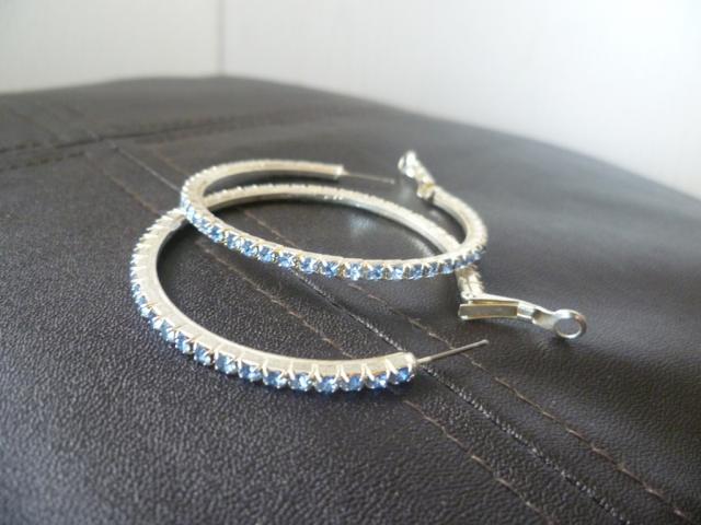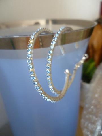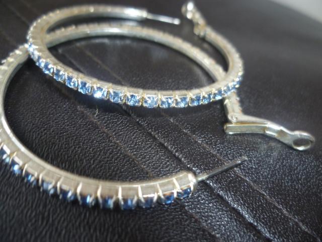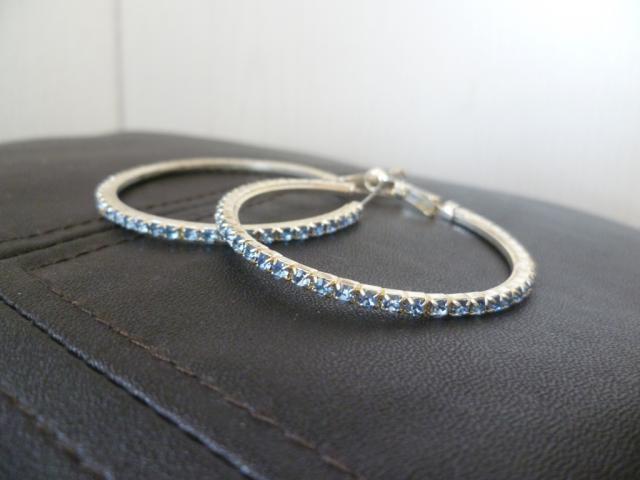 Nemažos rinkės su labai gražiai žvilgančiais žydrais kristaliukais. Tik minusas, jog iškritusi viena akutė ir vieno auskaro ties užsegimu kažkas truputį kliba:) O šiap dar galima juos nešioti, labai gražiai spindi prieš šviesą. Skersmuo-4,6cm