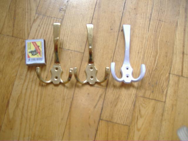 Du auksinės spalvos, vienas - baltas. Visi stiprūs, ta prasme, kad nenuluš pakabinus sunkesnį daiktą. Metaliniai. Tvirtinasi medvarzciais is "gerosios" puses. Po 1 eur.