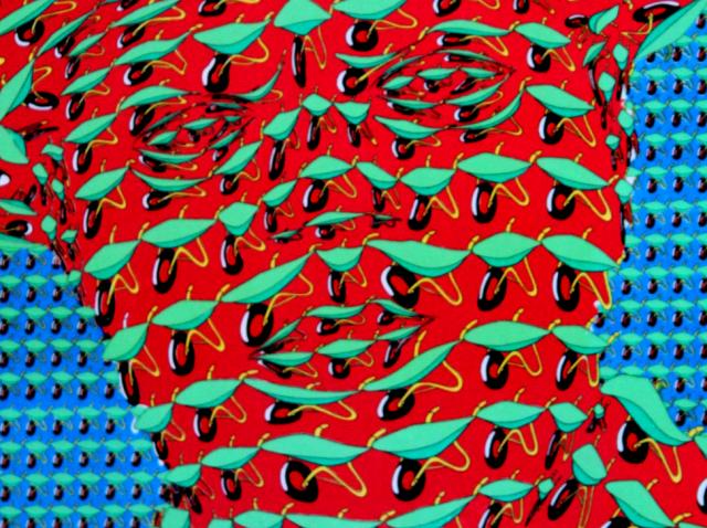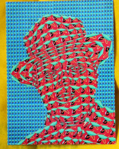 23 x 17 cm atvirukas - galerijos skrajutė. Veidas ir fonas sukurti iš karučių.