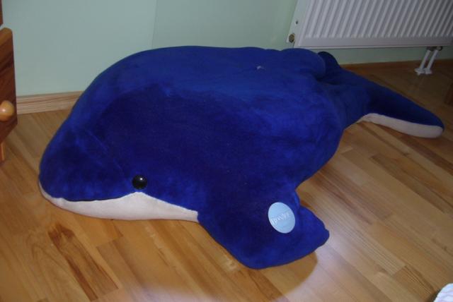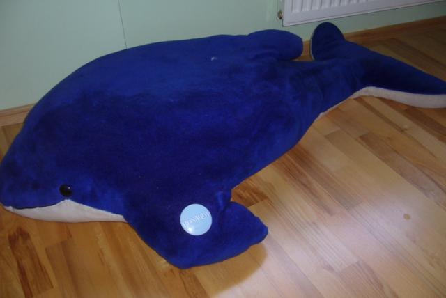 Didelis pliušinis delfinas. Ant jo labai patogu pasidėti "einamuosius" drabužius, arba šiaip sėdėti.