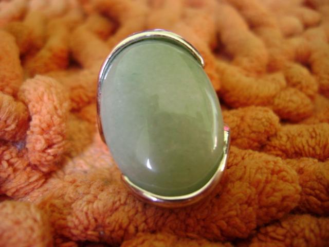Žalios spalvos akmenukas ovalo formos (1.7 cm ir 2.5 cm). Bandžiau išmatuoti pačio žiedo dydį - apie 1.9 cm.
