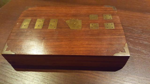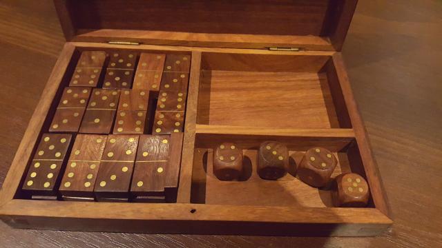 Rankų darbo dežutė, berods iš raudonmedžio ir žalvario, iš Indijos. Nežinau ar visi domino kauliukai..