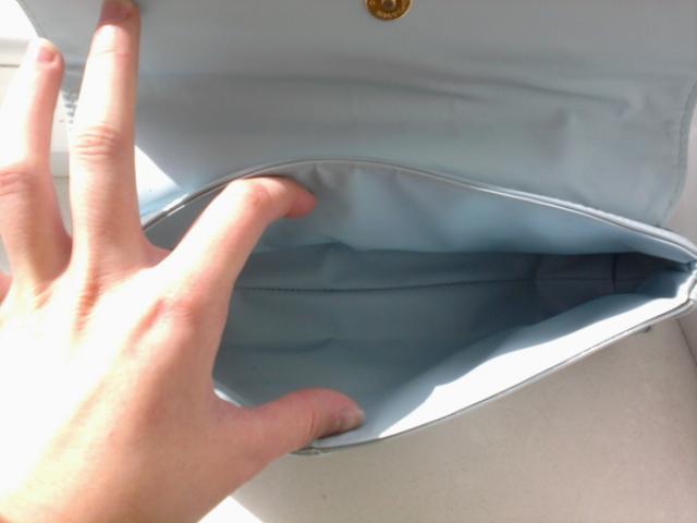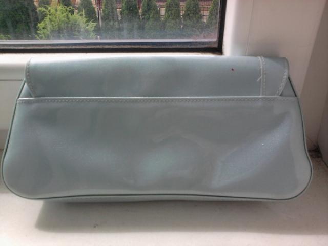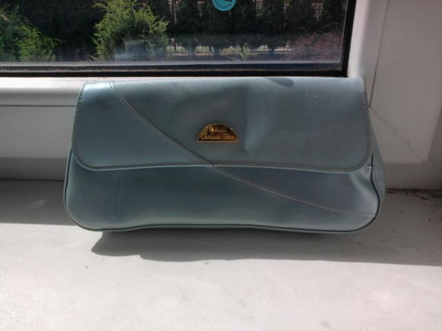 Christian Dior žydros spalvos lakinė delninukė (kopija). Atrodo nuotraukosė kaip susiglamžius, bet čia šešėlis taip krenta. Auksinė sagtelė per vidurį su firmos pavadinimu. Yra patepimų su tušinuku ir dar kažkoks raudonos spalvos nedidelis taškelis, tad reiktų nuvalyti, nebandžiau pati. Talpi, nedaug naudota. :)
