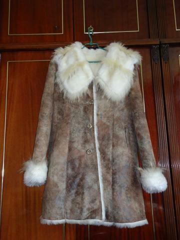 Dirbtiniai kailiniai.Yra priedo dar ir prisegamas kapisonas. Tikrai silti, nes nepraleidzia vejo. Apykakleje ir rankogaliuose yra tikro kailio intarpu.