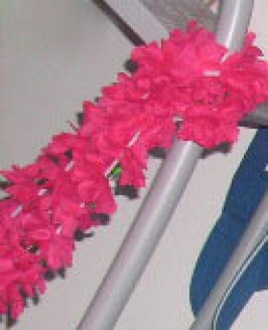 ryškiai rožinių dirbtinių gėlių a la havajietiškas vėrinys. ryškus ir drąsus stiliaus akcentas. ilgis - 90cm. man, esančiai 162cm ūgio nukara per mažą sprindį nuo krūtinės. nedaug naudotas