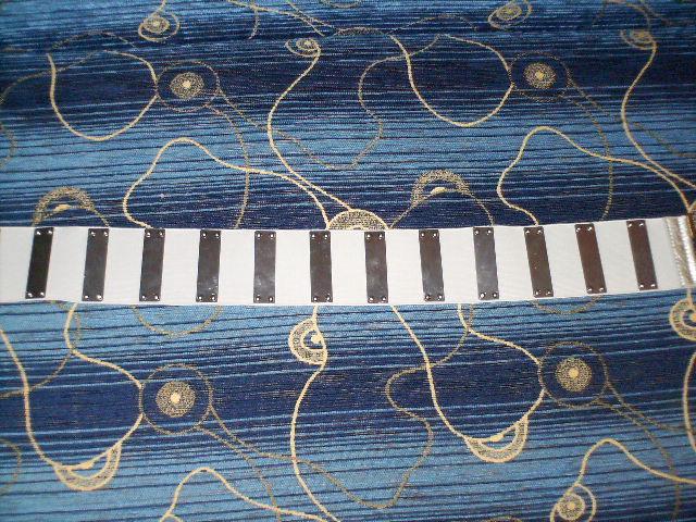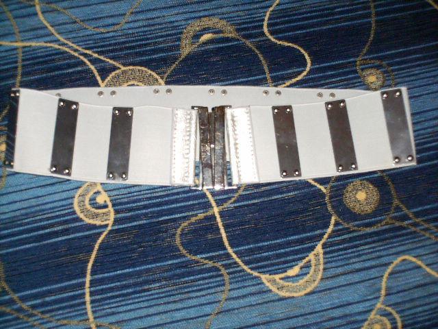 Platus , tamprus diržas. Sidabrinės/pilkos spalvos, puoštas metaliniais kvadratėliais.