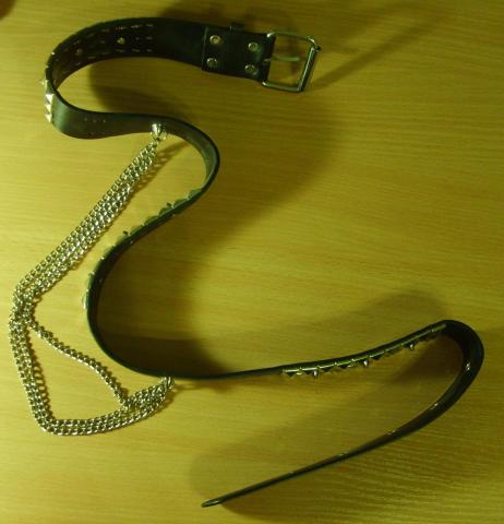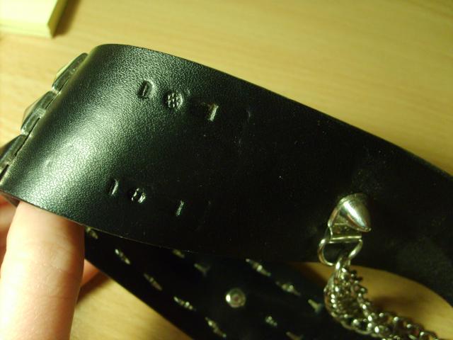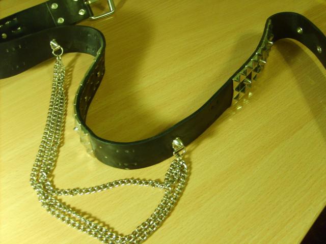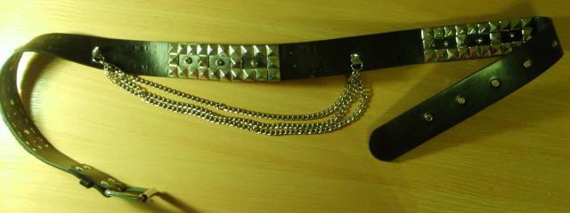 diržas su grandinėm, spygliais ir kvadratukais. paskutinėj nuotraukoj defektas - keliose vietose išėmiau kažkokius metalinius daiktus, tai likę nuo jų mažos skylės