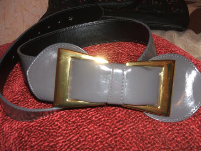 Diržas pirktas House parduotuvėjė. Lakuotas, pilkas su auksinės spalvos sagtimi.