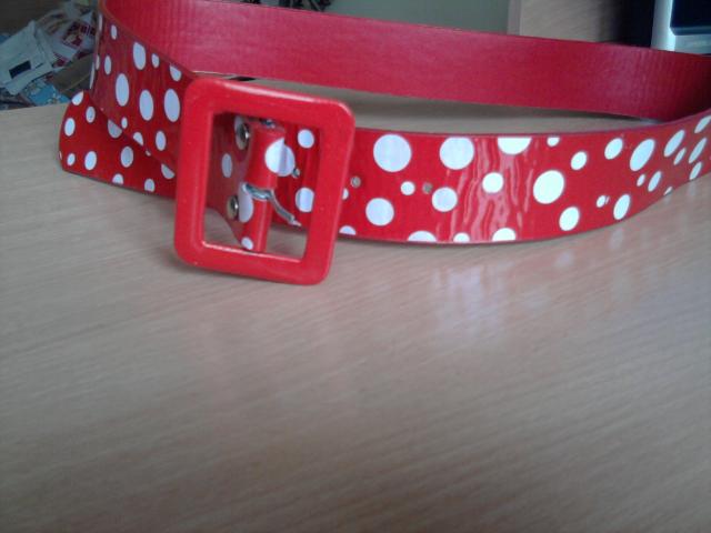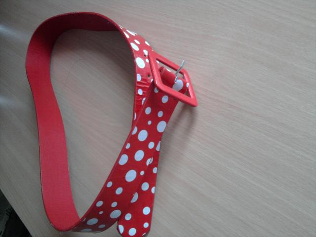 tvarkingas,nesuplesytas,nepazeistas raudonas su baltais taskeliais dirzas.
