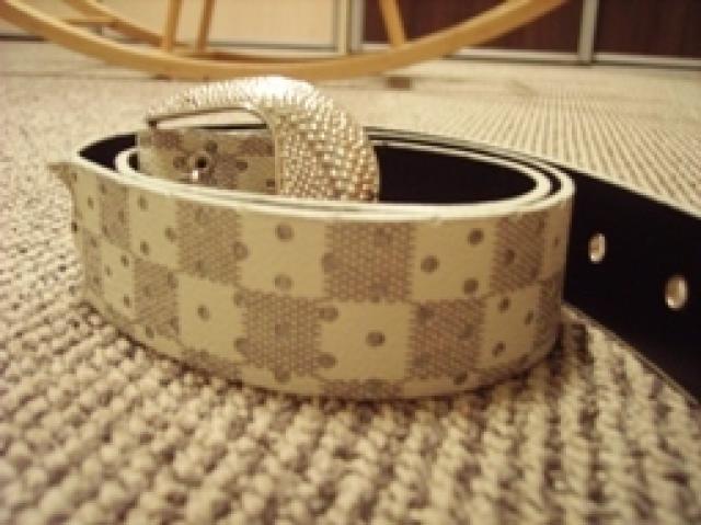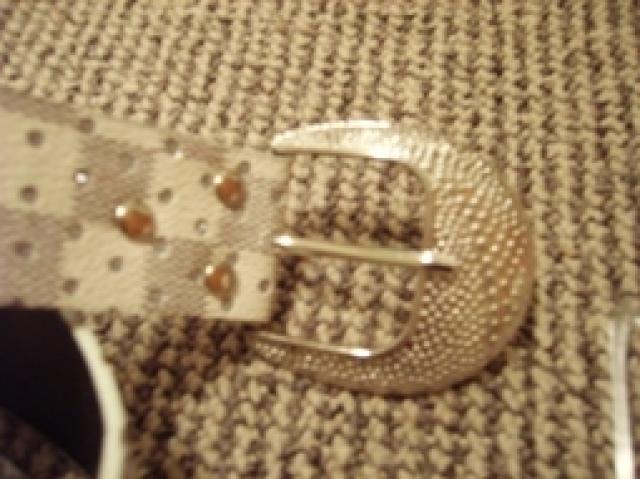 baltas diržas su blizgučiais, vienoj vietoj truputį įplyšęs, matosi 1foto.