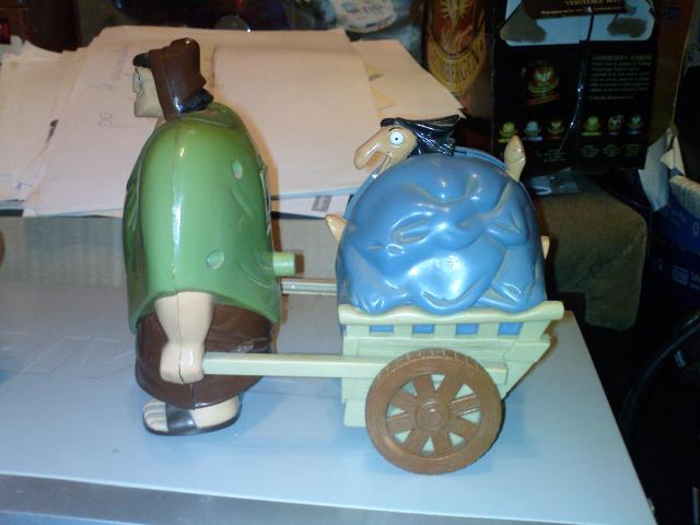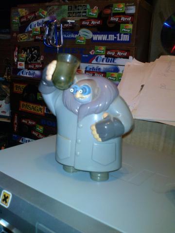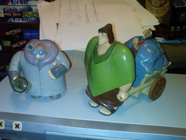 su funkcijomis - pilkas veikejas turi padidinimo stikla ant peties ir pakelus jo ranka, issoka akys ; kitas zaislas - sukant vezimo ratus vartosi, o i zmogysta galima pripilti vandens, kuri jis paspaudus mygtuka purskia pro skylute po kaklu. disney originalai. aukstis 10-12cm.
