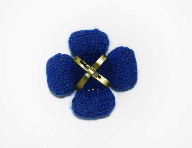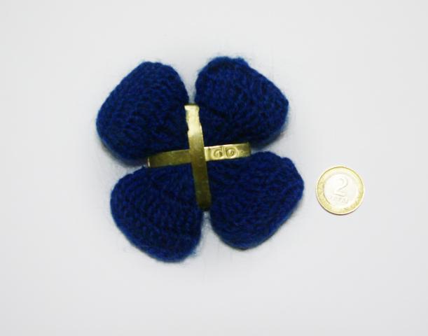 Keturalpis mėlynas nertas dobilas su žalvariniais apkaustais. Viename lapelyje sutrupėjo apnertas plastikas, bet ne esmė.