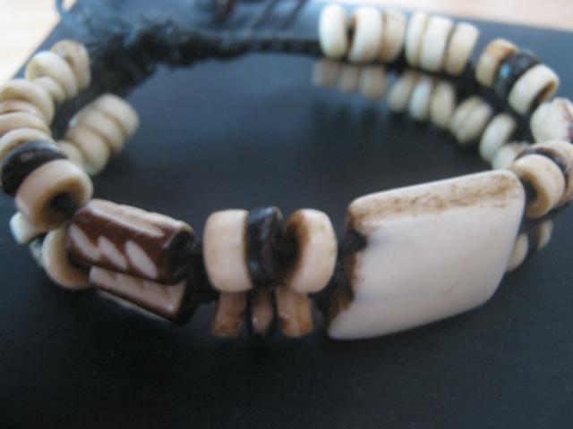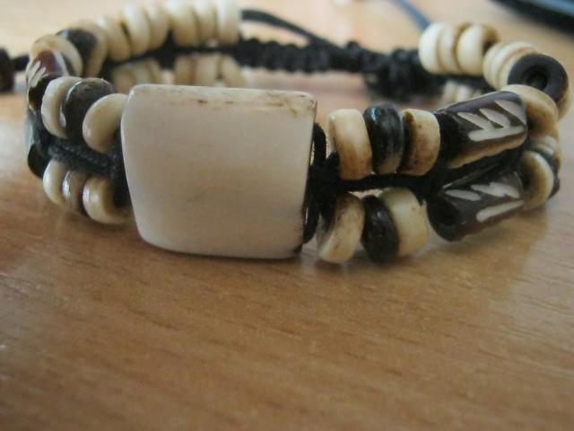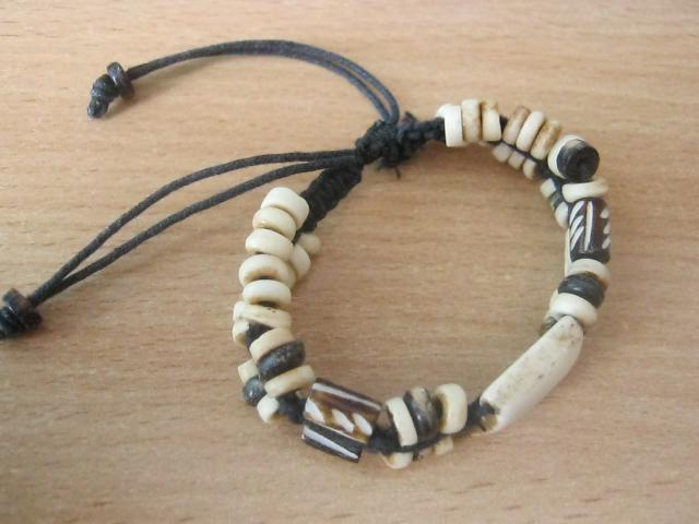 Įdomi, graži apyrankė. Nežinau ar tie karoliukai iš kaulo ar iš kažkokio akmens panašaus į kaulą.