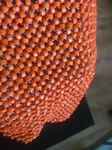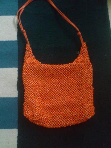 Įdomi rankinė, padaryta iš medinių karoliukų, suvertų ant šilkinio siūlo, rankena - 2 odiniai iduj - oranžinis pamušaliukas, yra viena neužsegama kišenėlė. Pati tašytė užsisega užtrauktuku. Išmatavimai - plotis - 25cm, aukštis 18cm, apačioje tarsi dugnas padaryta 8 cm praplatėjimas, bet kieto dugno nėra. Pati minkšta, be pakietinimų.