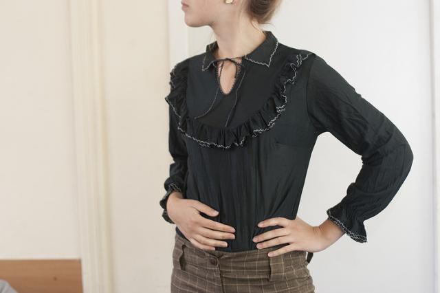 Palaidinė gražios jūros spalvos, su kvarbatkom ir surišimu ties kaklu :) Trumpas liemuo, praktiškai tiek, kiek matosi nuotraukoje. Gražiai atrodytų sukišta į kelnes ar sijoną nežemintu liemeniu. 36-38d. Pamušalinis trikotažinis audinys.