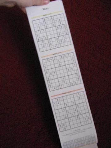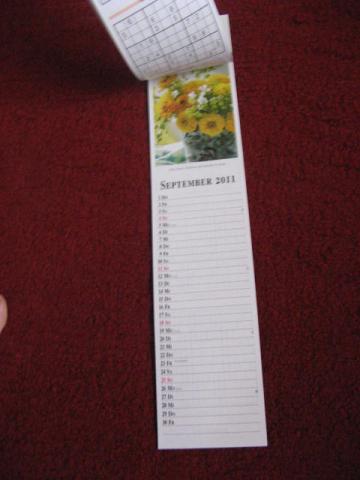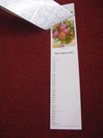 ideali būklė, viena diena - viena eilutė, dienos surašytos vokiečių kalba, bet jei nemokasi vokiškai dienų pavadinimų, tai šešt ir sekm kita spalva, tad lengva atsiskaičiuoti. viršuj gėlės pavieksiukas, o nuplėšus lapelį kitoje pusėje yra po 3 SUDOKU. yra ir sudoku ats :)