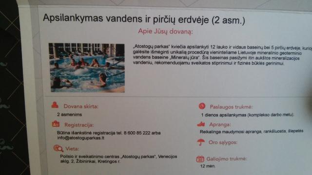 Dovanų čekis iš geradovana.lt Apsilankymas vandens ir pirčių erdvėje(2asm) visai dienai.Klaipėdoje Atostogų parke.Galioja nuo 2017.07.17 iki 2018.07.17