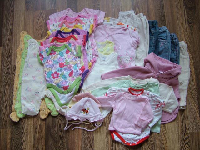 Visi drabužėliai švarūs ir tvarkingi. Nuo 54 iki 68 cm ūgiui. Berankoviai smėlinukai: 2, trumpom rankovėm smėlinukai: 8, ilgom rankovėm smėlinukai: 2, trumpom rankovėm ir klešnėm smėlinukai: 3, šliauštukai: 3, kelnės: 6, kepurytės: 3. Po 1: apatiniai marškinukai su užverčiamom pirštinėlėm, ilgom rankovėm marškinėliai, megztukas su kapišonu. 8 678 88688 Agne