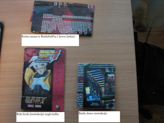 Dragon ball Gt kortu kalade, dezute kiek aplankstyta, yra visos 51 kortos, instrukcija, kovos laukas su kortu sarasu ir demo kovos taisykles.