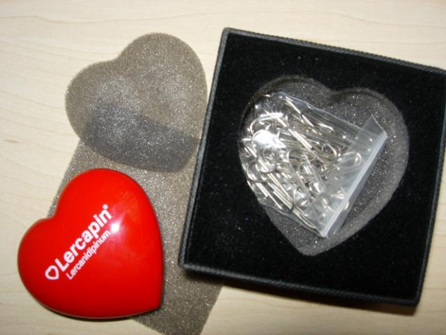 Naujas, dėžutė aksominiu vidumi. Širdelė magnetinė, prie jos limpa sąvaržėlės. :) Puki dovana. :)