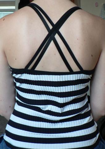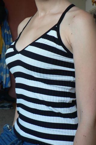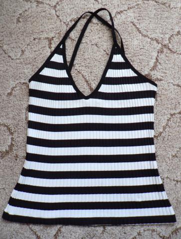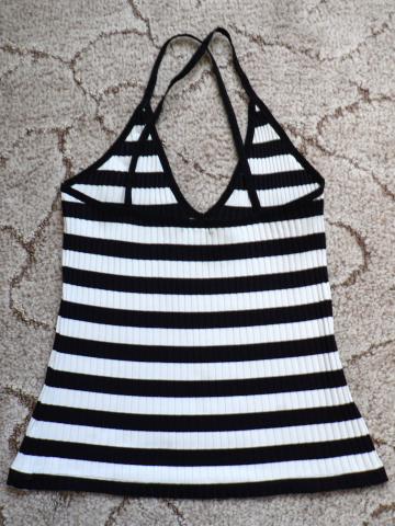 Dryžuota palaidinukė ant petnešėlių. Nurodytas M dydis, bet tiks ir S, S/M. Yra nedidelė dėmelė, kuri, manau, turėtų išsiplauti. Jeigu pageidautumėte, galiu paslėpti kaspinėliu.