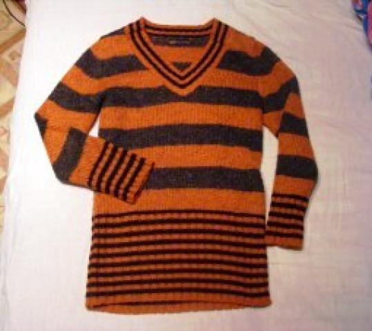 nesenai pirktas, oranžiniai - pilkai dryžuotas. Ilgas, uždengia beveik visą užpakaliuką.