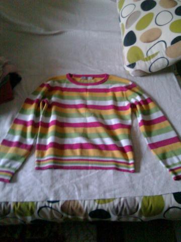 Labai mielas dryžuotas, spalvotas megztukas, man jis šiek tiek per trumpas, neturi defektų, nors nešiojau, tinka ir M dydžio