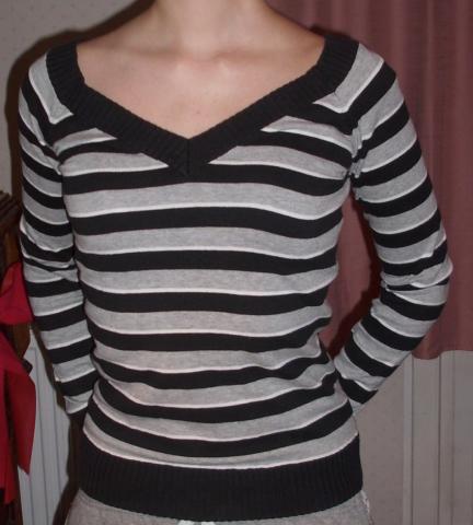 Dryzuotas juodai pilkas baltas megztukas, turi V formos iskirpte priekyje ir nugaroje. Labai malonus kunui.