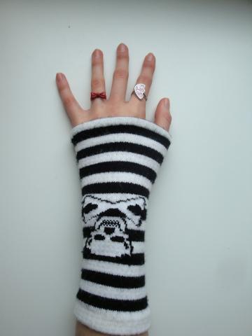 Šiltos juodai-baltai dryžuotos pirštinės su kaukolėmis, be pirštų.