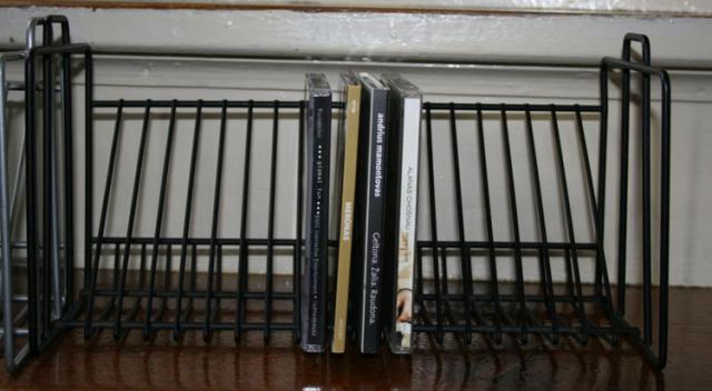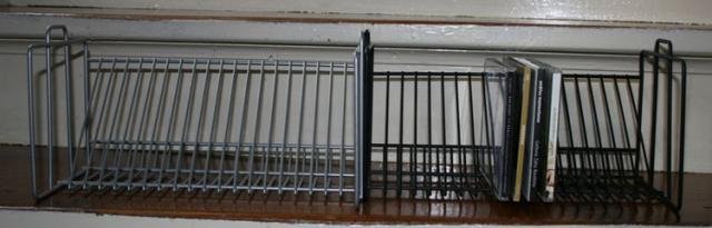 Vienas juodas ir vienas sidabrinis cd stovas, telpa apie 15 cd kiekviename