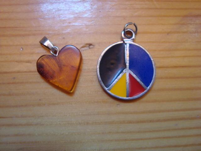 Du pakabukai:gintarine sirdele ir spalvotas peace.