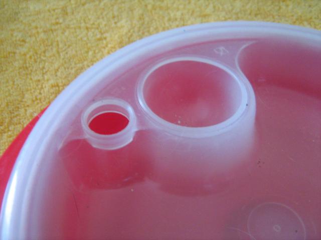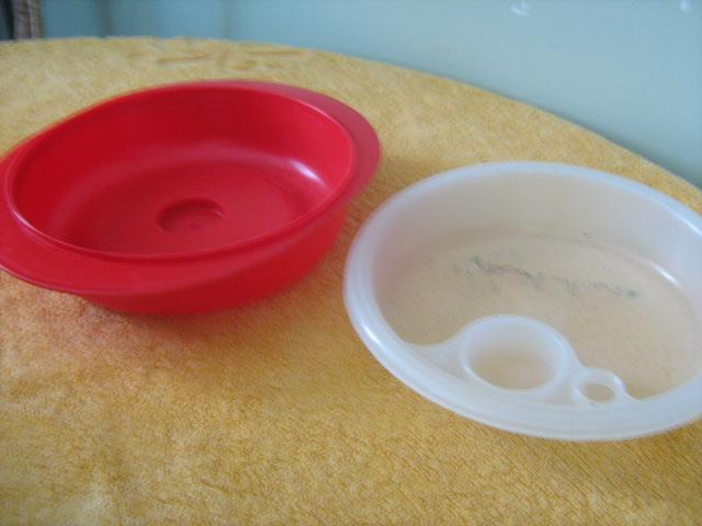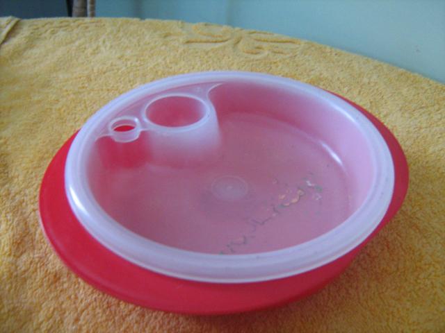 Specialus dubenelis, kad maistas ne taip greit atsaltu. Kudikiams. Pamestas zaisliukas kuris prie jos tvirtindavosi ir dabar ten skylute. Matosi foto.