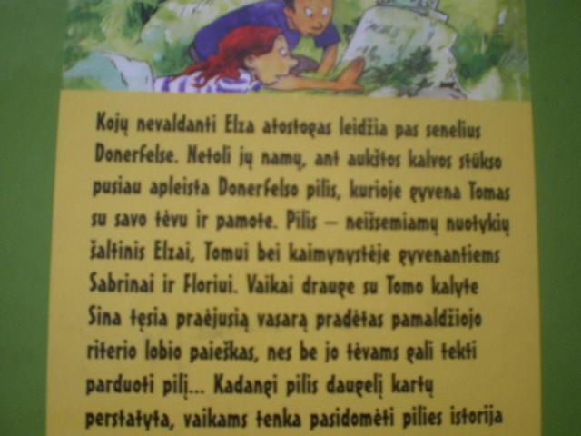 Kojų nevaldanti Elza atostogas leidžia pas senelius Donerfelse. Netoli namų, ant aukštos kalvos stūkso pusiau apleista Donerfelso pilis, kurioje gyvena Tomas su savo tėvu ir pamote. Pilis – neišsemiamų nuotykių šaltinis Elzai, Tomui bei kaimynystėje gyvenantiems Sabrinai ir Florui. Vaikai drauge su Tomo kalyte Sina tęsia praėjusią vasarą pradėtas riterio lobio paieškas, nes be jo tėvams gali tekti parduoti pilį...Kadangi pilis daugelį kartų perstatyta, vaikams tenka pasidomėti pilies istorija krašto muzi